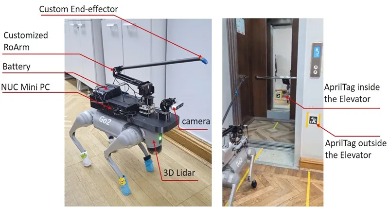 وفي مرحلته الأولى، طوّر الفريق البحثي نظامًا ذاتي التشغيل يتيح لروبوت رباعي الأرجل استخدام المصاعد والتنقل بين الطوابق في المباني التقليدية. ويعتمد هذا النظام على تقنيات متقدمة، تشمل نموذج رؤية حاسوبية قائمًا على YOLOv11، ومحاذاة مكانية باستخدام رموز AprilTag، وذراعًا روبوتية ذات أربع درجات حرية. وقد أظهرت التجارب الميدانية التي أُجريت في مبنى أكاديمي مكوّن من أربعة طوابق، نتائج دقيقة في عملية التنقل، محققةً دقة تقلّ عن السنتيمتر، ونسبة نجاح بلغت 100% في جميع التجارب. وستركّز المرحلة الثانية من المشروع على تمكين الروبوت من إجراء عمليات تفتيش ذاتية لمكوّنات المباني، بما في ذلك الأطر والأبواب، ومعدات السلامة من الحرائق مثل أجهزة الإنذار والمطفآت ورؤوس الرش الآلي، إلى جانب التجهيزات المثبتة على الجدران، ولوحات الكهرباء، والمكونات الهيكلية كالأعمدة والأسقف.